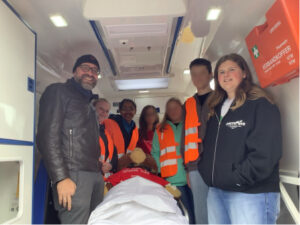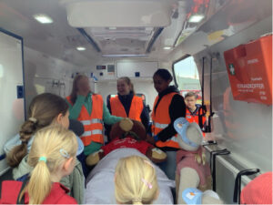 Mit ansteckender Freude und Begeisterung zeigten Sie den vielen neugierigen Kindern den Rettungswagen des DRK. Die Kids halfen dabei den großen Bären Benny, der aus dem Bett gefallen war und nun dringend versorgt werden musste zu verarzten. Gemeinsam mit den Schulsanis wurde der Bär untersucht, Fieber gemessen und sogar „Medizin“ über einen Zugang verabreicht.
